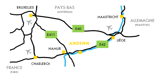 Située entre Namur et Liège, Andenne occupe une position centrale en Wallonie, à proximité de 3 grands axes autoroutiers (E411, E42 et E40) et est facilement accessible depuis les principaux pôles wallons.