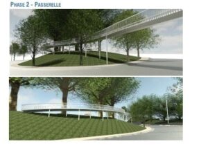 Un des éléments phare du projet est sans aucun doute la passerelle qui reliera les deux zones surélevées du parc. Conçue pour s’intégrer harmonieusement dans le paysage, elle permettra de connecter les deux espaces sans affecter les arbres existants. Cette passerelle cyclo-piétonne sera réalisée en acier corten, une matière robuste et esthétique, et surplombera le boulevard César Thomson à une hauteur de 4,5 mètres.